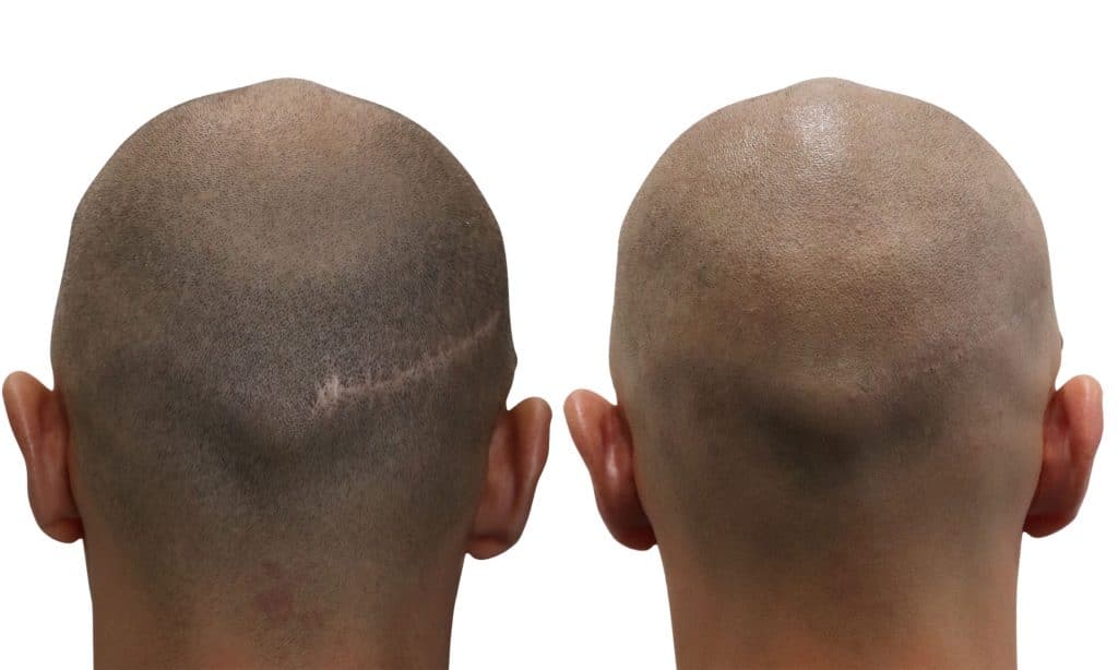 Two types of hair transplant procedures would ultimately result in unwanted scars. Follicular Unit Transplantation (FUT) will leave a strip across the back or side of the head and Follicular Unit Extraction (FUE) will leave small circular scars dotted across the head.